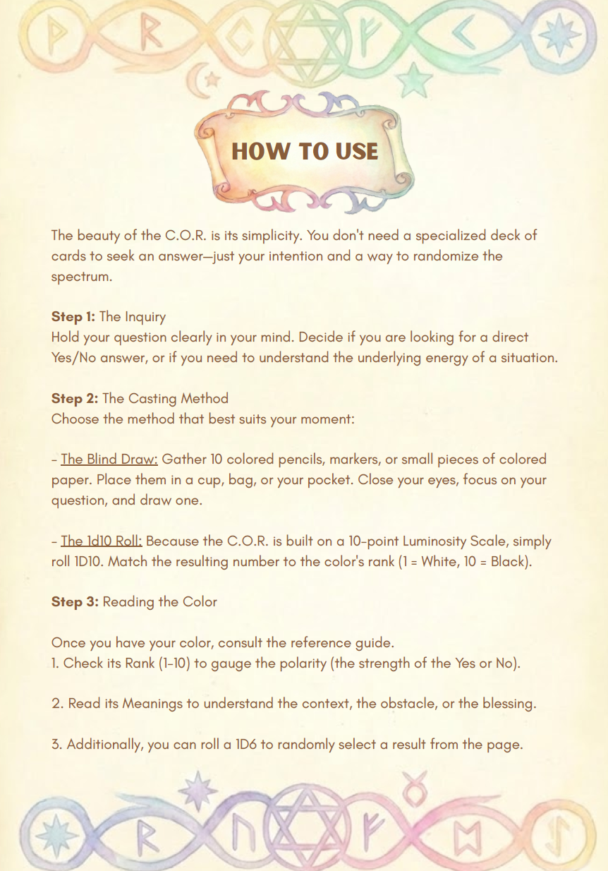 My intention with C.O.R. was to create a unique oracle that feels completely different from the traditional ones. While standard oracles often rely on text-heavy verb/noun tables or simple "Yes/No" dice rolls, C.O.R. taps into something far more intuitive and visual: the spectrum of light.
